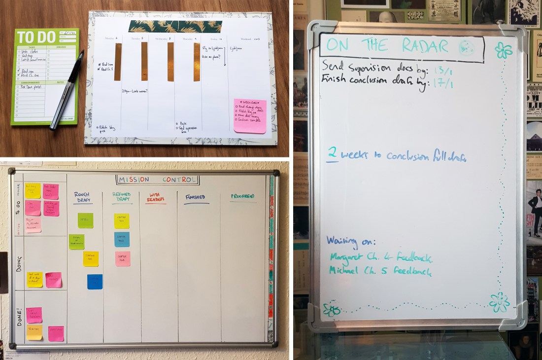 Finally finally, my On the Radar whiteboard has been propped up against the wall beside me since the very early days of my PhD. I like to keep tabs on when my work is due to be sent off to my supervisor and how long I have left until self-set chapter deadlines. I’ve added in the section at the bottom more recently – now that completion deadlines are getting closer, it’s helpful to know who I’ve sent chapter drafts to and whether or not they’ve responded with feedback.