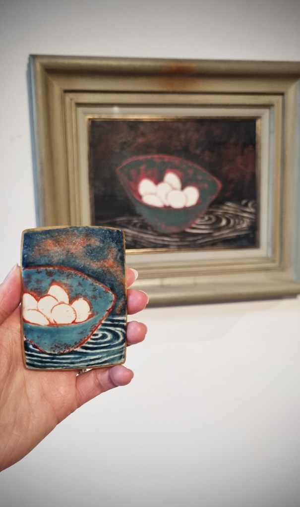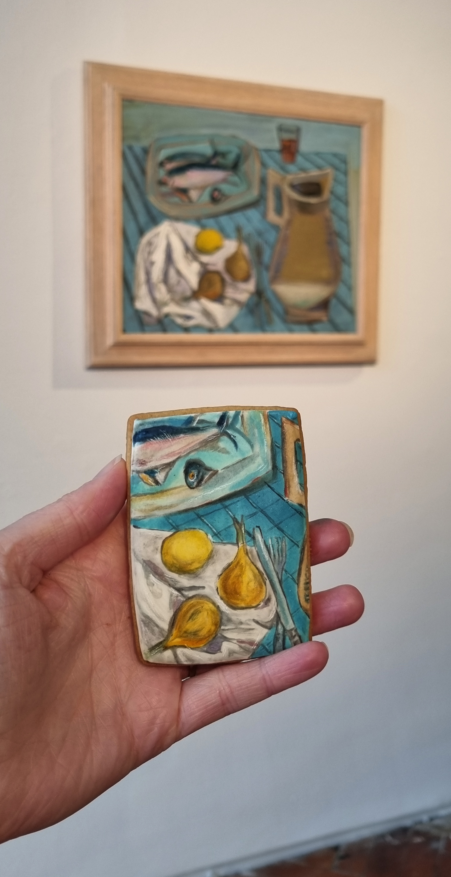 Context: Created in-situ during a 3-day residency at Crawford Art Gallery as part of an exhibition titled Meat and Potatoes. Each biscuit is inspired by an artwork featuring in the exhibition. Moving clockwise from the top left, the artworks include: