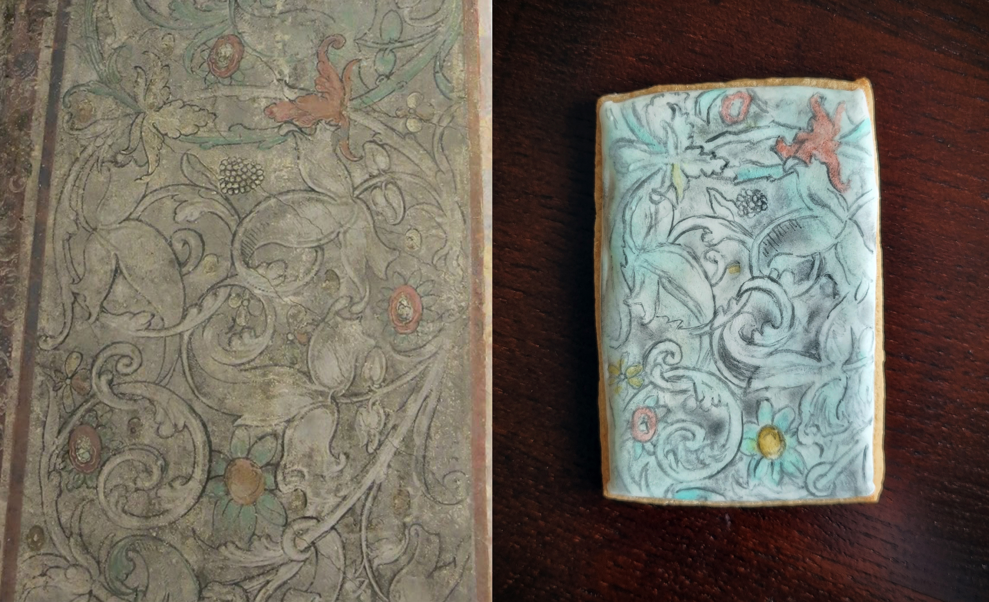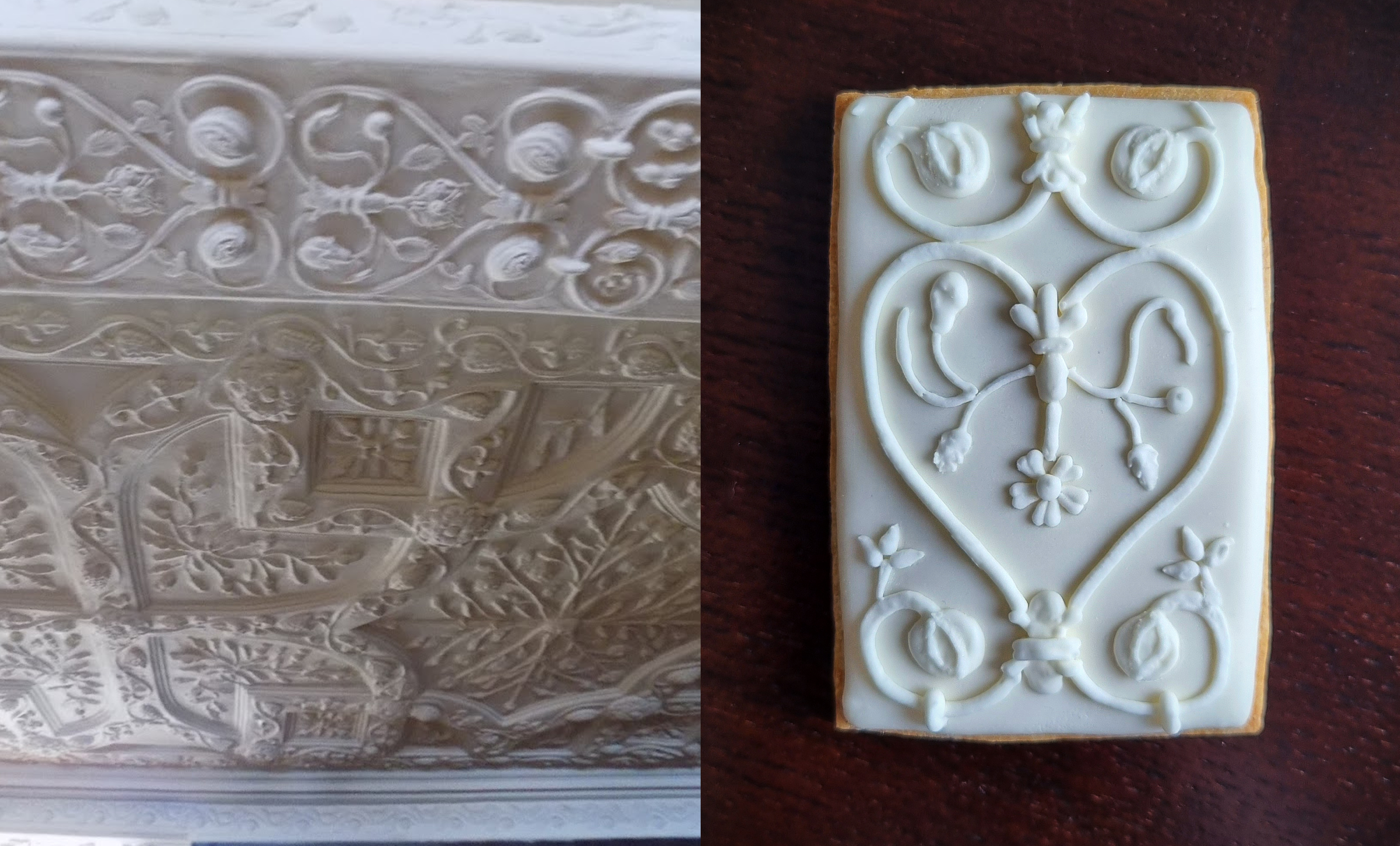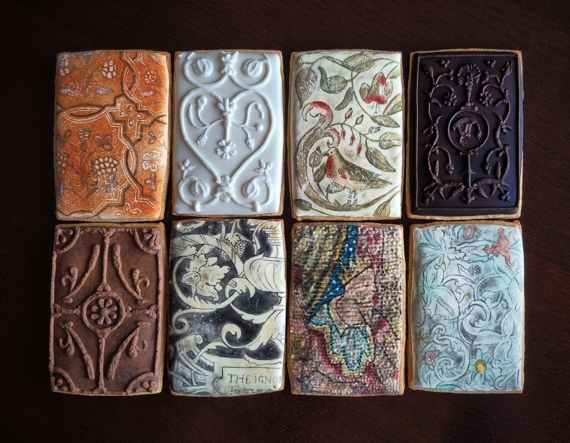 Decoration: Royal icing base. Some designs painted onto royal icing using food colouring gels and vodka, others piped in royal icing. Aged effect created using a sgraffito technique.