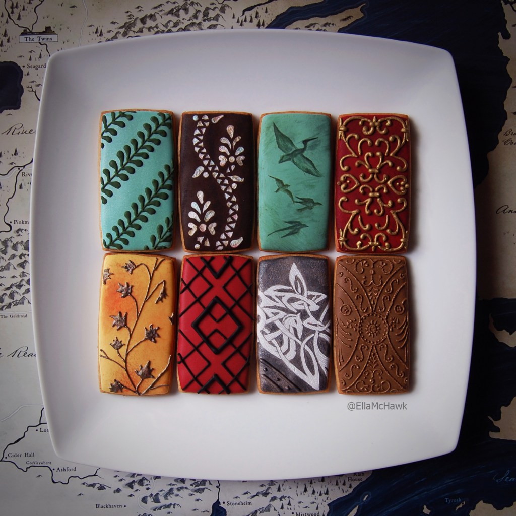 Decoration: Royal icing base. Designs piped in royal icing, etched into the icing surface, and/or painted by hand with gel food colourings, edible lustres, and vodka.