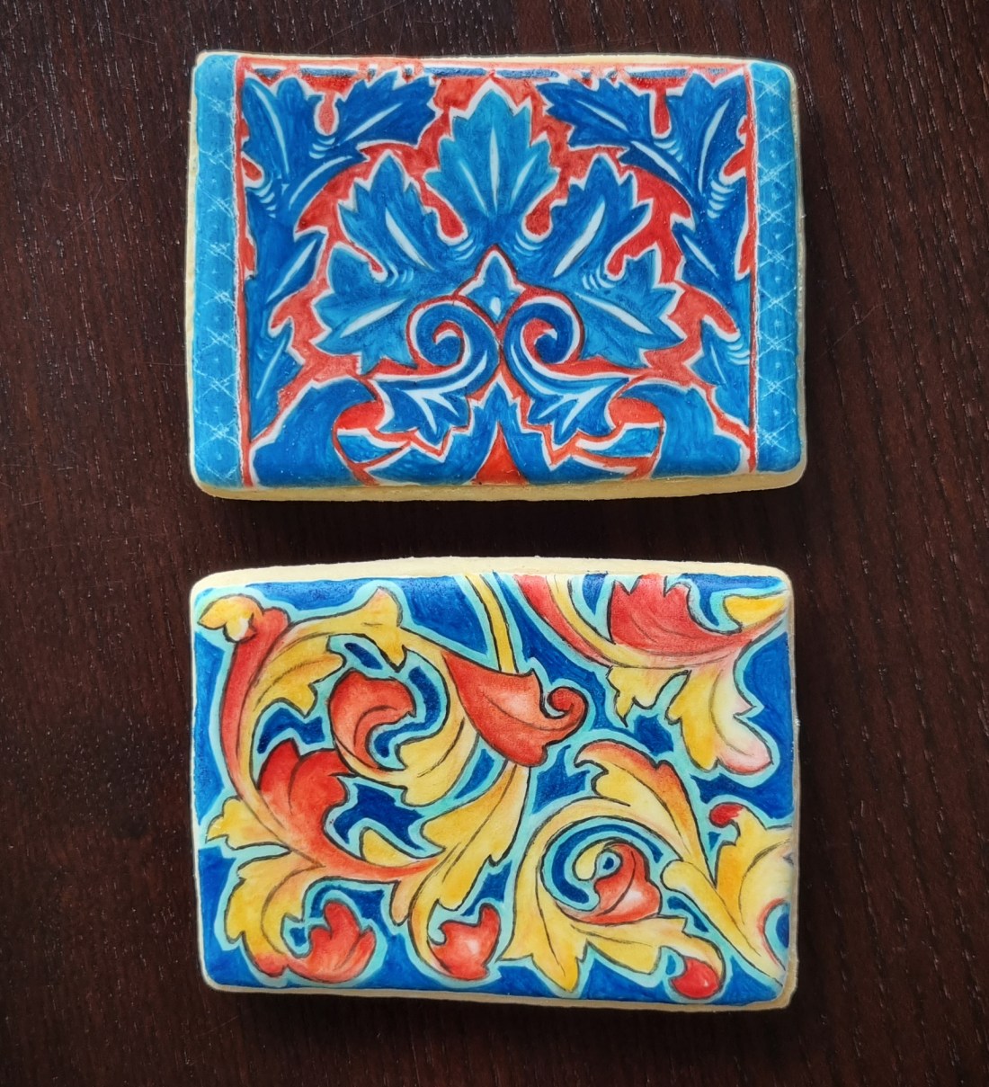 Decoration: Royal icing base. Both designs painted onto royal icing using food colouring gels and lemon juice.
