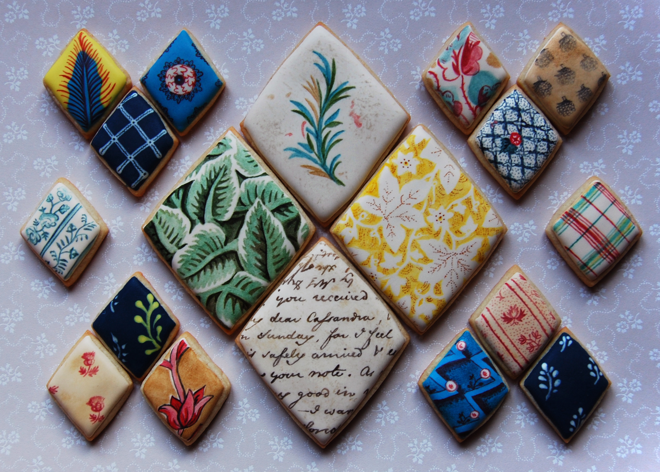 Context: Inspired by a patchwork coverlet made by Jane Austen, her sister Cassandra, and their mother. The large biscuits in the centre feature patterns from Jane Austen’s House (wallpaper designs, L and R) and related collection items (a needle case and a letter from Jane to Cassandra, top and bottom). The smaller biscuits are based on some of the 64 dress and furnishing cottons that the Austen women collected and crafted to form the coverlet.