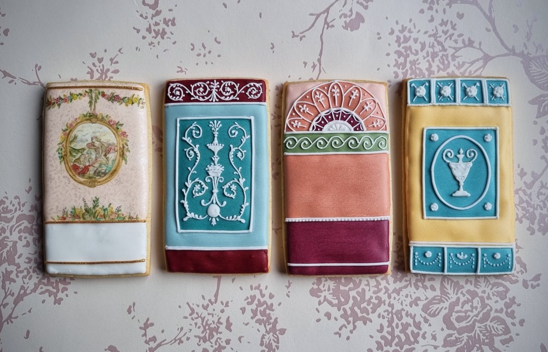 Decoration: Royal icing base. Some designs painted onto royal icing using food colouring gels and vodka, others piped in royal icing.
