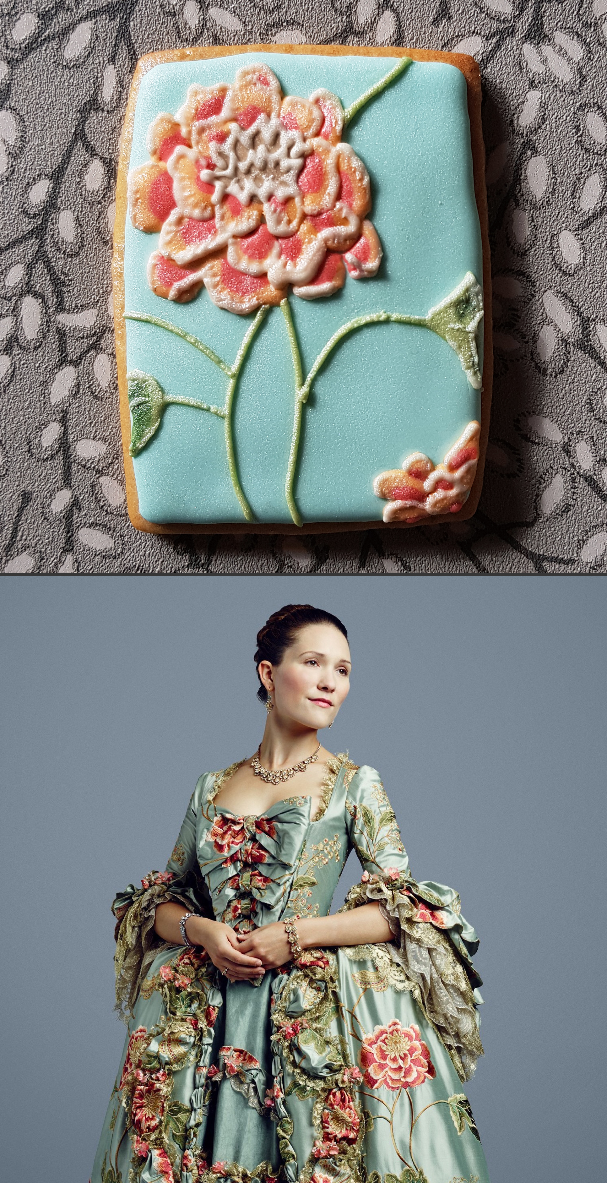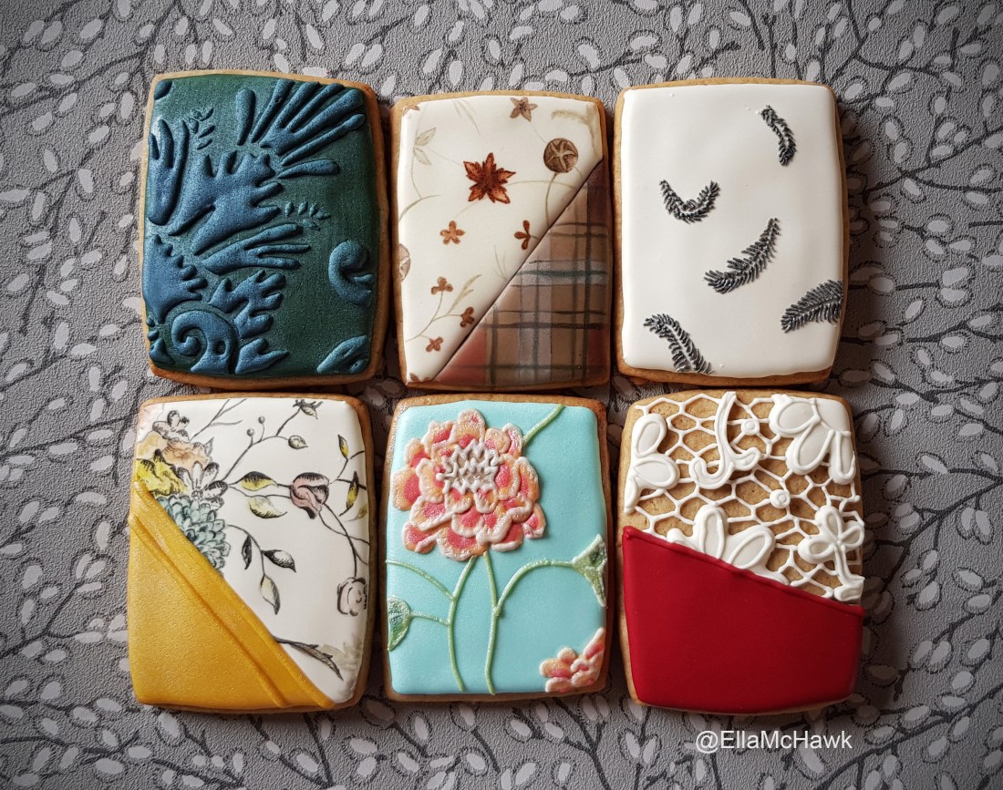 Decoration: Royal icing base. Some designs were painted by hand with gel food colourings and edible lustres, others featured hand-piped royal icing details.