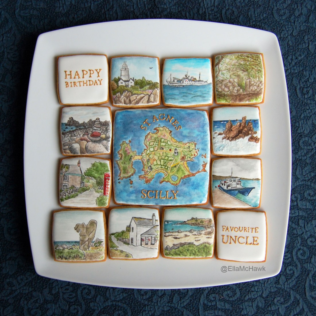 Decoration: Royal icing base, painted by hand with gel food colourings and edible lustre. You can find a making-of video for this biscuit set here.
