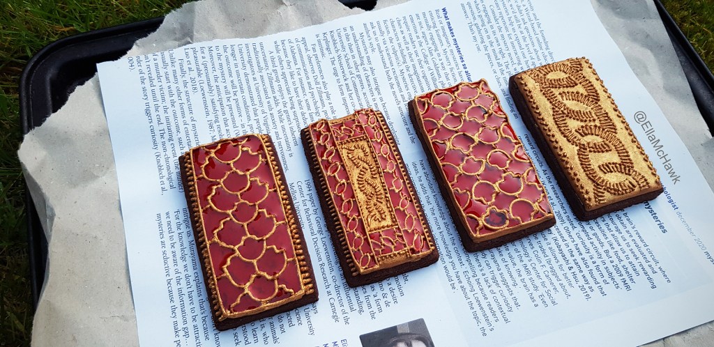Decoration: Royal icing base. Details hand-piped in royal icing and painted with edible lustre. Garnet effect created using piping gel. You can find a making-of video for this biscuit set here.