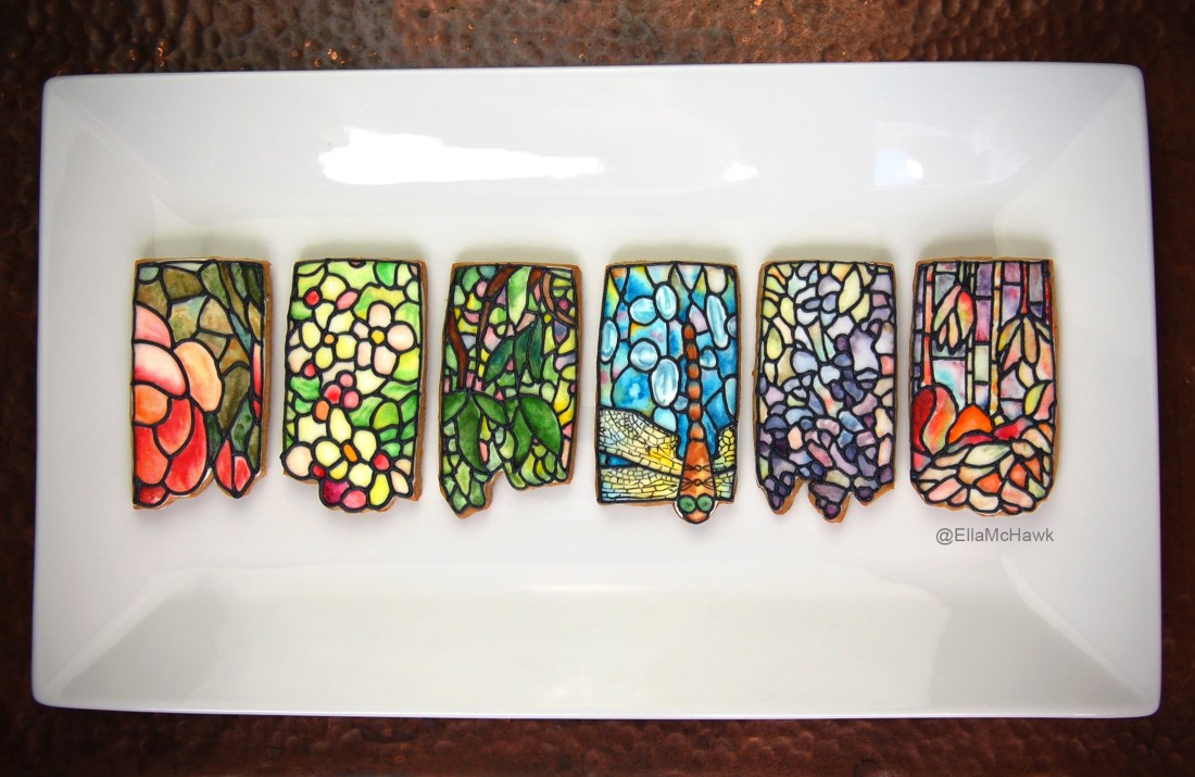 Context: Inspired by Tiffany Studios lamps created between 1902 and 1932. Designs represented in the set include (from left to right): Lotus, Apple Blossom, Laburnum, Dragonfly, Wisteria, and Pond Lily.